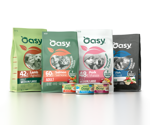 Con Oasy ti prendi cura del benessere del tuo cane e del tuo gatto: ogni alimento contiene tanta carne e ingredienti naturali selezionati con cura per offrire la massima digeribilità, il giusto apporto di nutrienti e tanto gusto.